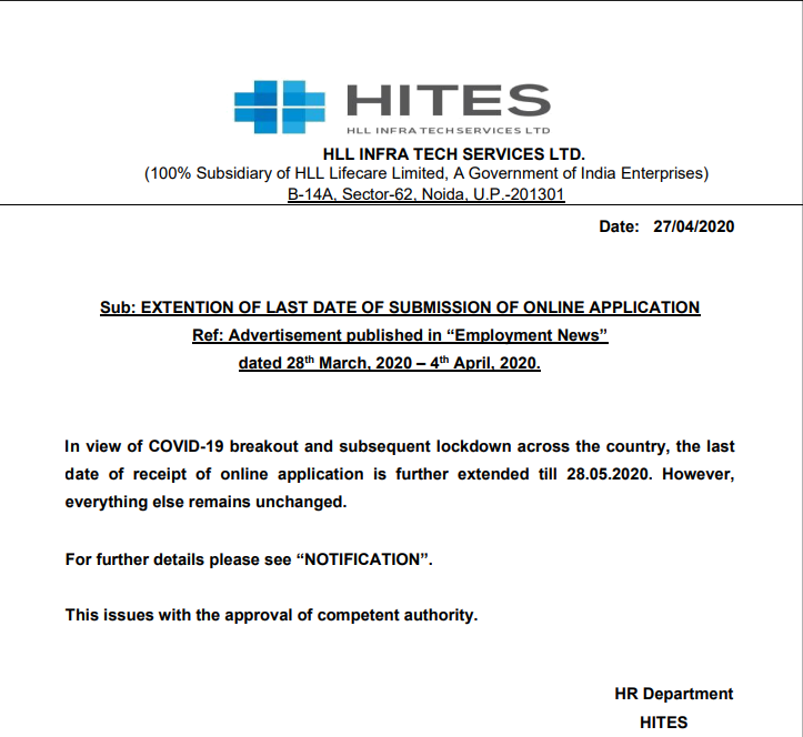 HLL HITES Recruitment 2020: The HITES has extended the last date to apply for the online application, in view of subsequent lockdown across the country. The Online Application is now available till 28th May 2020. Check the online application extension notice, eligibility, vacancy in the notice.