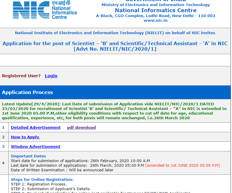 NIELIT Scientist ‘B’ and Scientific/ Technical Assistant – “A” Recruitment 2020: NIELIT has extended the online Application Date till 01st June 2020. Check the image below for the date extension conformation. Earlier, the NIELIT has released a recruitment notification 2020 to recruit eligible candidates for the post of Scientist and Scientific/ Technical Assistant. National Institute of Electronics and Information Technology(NIELIT) has notified a total no. of 495 vacancies under advt. no. NIELIT/NIC/2020/1 dated 23rd February 2020. Qualified and eligible candidates shall apply for the aforesaid post for filling up of Scientist and Scientific/Technical Posts in the National Informatics Centre(NIC). The eligibility criteria, important dates, selection process, how to apply online has been provided in this article below.